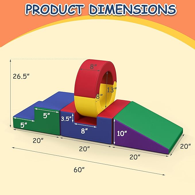 - VERSATILE USAGE: Assembled toddler climbing toys measures 60" L x 20" W x 26.5" H.The inner diameter of the sole circle is 13", enough for toddler to pass through.The colorful foam play set is perfect for indoor use, such as in the living room, amusement park, kindergarten play area, children's training institutions, shopping mall rest areas, etc.