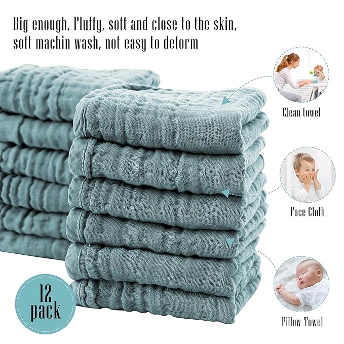 Cute Castle 12 Pack Muslin Burp Cloths for Baby - Ultra-Soft 100% Cotton Baby Washcloths - Large 20'' by 10'' Super Absorbent Milk Spit Up Rags - Burpy Cloths for Unisex, Boy, Girl - Dark Green
