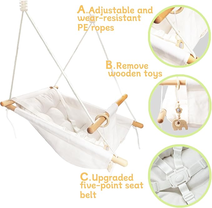 - 【Suitable for Indoor and Outdoor Use】This baby swing is very versatile. You can install it as an indoor swing in the baby's room or an outdoor swing for kids in the backyard. You can also use it as a tree swing on a backyard tree. But be careful! Since it's made of canvas and wood, don't use it in a humid place or on rainy days.