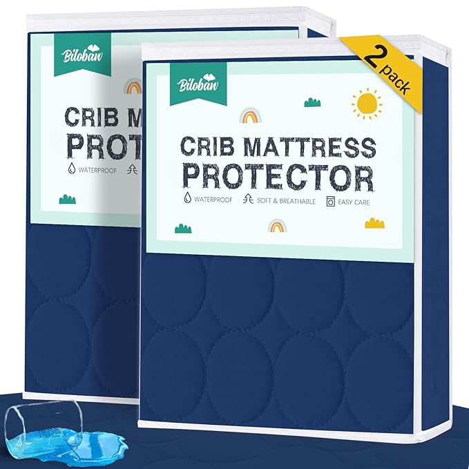 Biloban Navy Blue Crib Mattress Protector 2 Pack, Waterproof, Quilted, Absorbent, Noiseless, Durable Mattress Cover, Perfect Fit for Toddler Bed