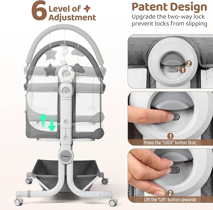 Cowiewie Baby Bassinet 2-1 Beside Sleeper with Wheels & Hanging Toys for Baby Foldable Adjustable Height Portable Bassinets (GREY)