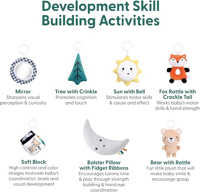 - Woodland Adventure: This woodland -themed baby boy or girl activity play gym features a fox, bear, deer, owl, hedgehog, and a cozy play mat, encouraging imaginative exploration for your little discoverer.