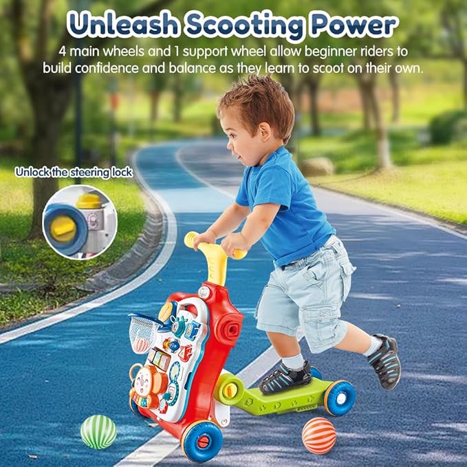 - 5 In 1 Sit-to-Stand Design: Start off with a detachable learning panel and activity table for sit-down play,then use as a push walker when your yearling starts to toddle. Transform the baby walker into a ride-on as your toddler grows,then a scooter to strengthen legs and arms as they play,A push walking toy that accompanies your child for years to come