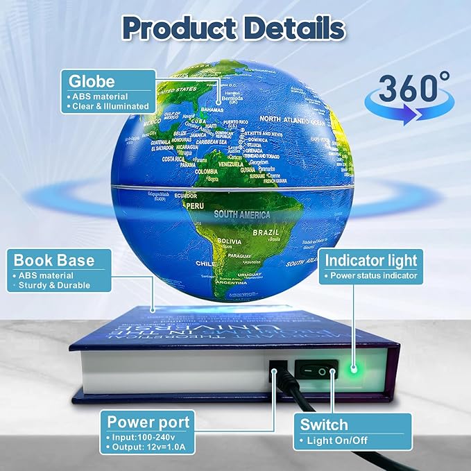 - BOOK BASE - The globe floats on a sleek and sturdy ABS book base. The base features a unique design that looks like an actual book, complete with a spine and pages, making it a perfect addition to your bookshelf or coffee table. The floating globe is a perfect elegant decoration for spaces like at home, office, school, shop, or meeting room.