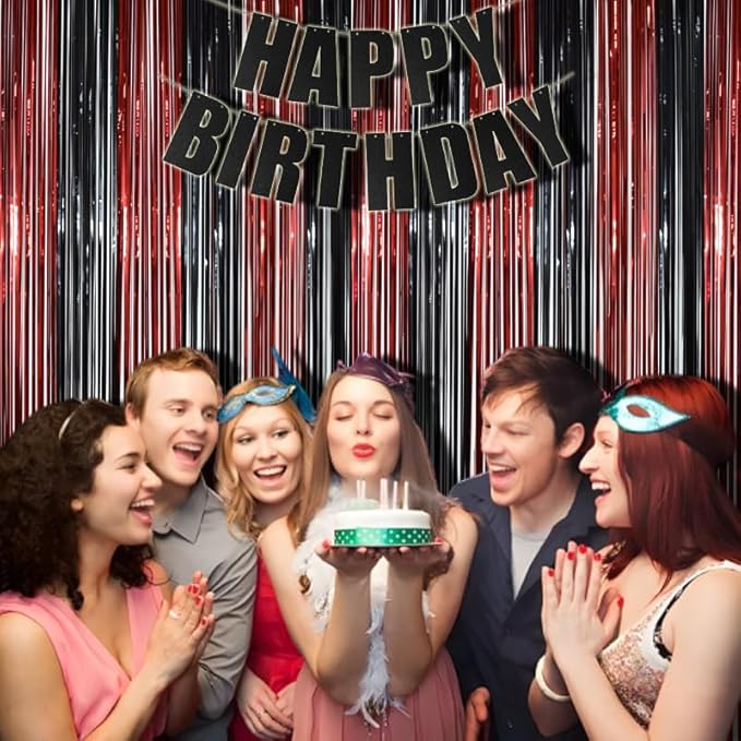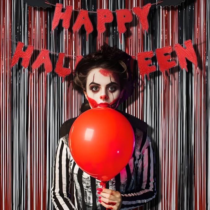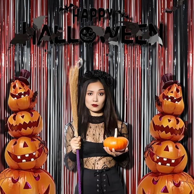 BRAVESHINE Tinsel Photo Backdrop Curtains - 2 Pack 3.2x8.2ft Black Red Foil Fringe Streamer Curtain for Halloweens, Lantern, Pumpkin, Home, Indoor or Outdoor Party Supplies Decorations