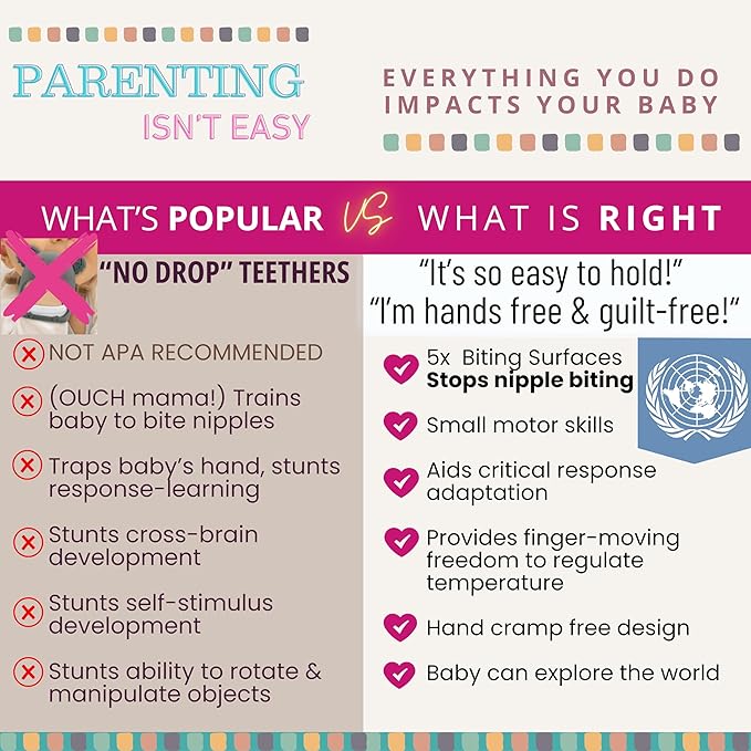 - Big days ahead, baby! Big tears or big grins? Only mom or dad can decide how fast you’re soothed & more than 10,000 reviews proves these Mom Consortium Created baby teethers 6 to 12 months help every step of the way, with 5x rapid relief surfaces, multiple easy to grip angles that won’t cause baby delays like no drop teething toys, and a Pediatric Dentist Approved teething ring design. The ideal silicone teether to help baby through that ultra-drooly “Chomper Charmer” stage.