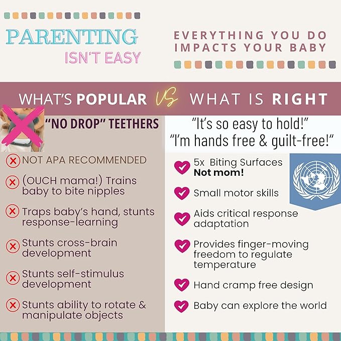 - Your hands free, without the harm - do what’s popular? Or what’s right? Don’t delay your baby - while no drop teething toys and mittens could cause significant delays by blocking babies hand from grasping, dropping and passing objects back and forth - a critical motor skill - Baby Elefun teether is the easiest to hold Pediatric Dentist Approved teething ring without stunting critical sensory development. Thanks mom and dad!