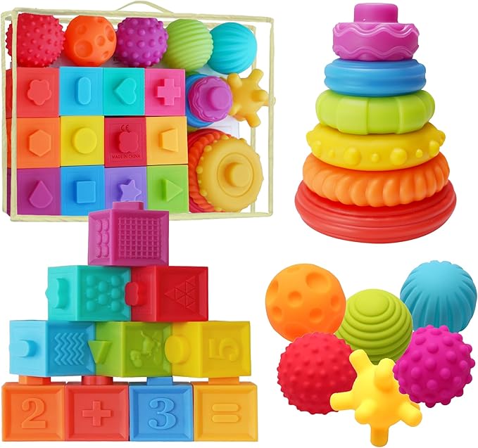- Diverse Stacking Sensory Toy - These connecting baby building blocks, stacking rings, and textured balls are easy to pick up and stacked together for newborn babies, infants, & toddlers. They will make a squeaking sound when you squeeze the soft and interactive toys. Identifying numbers and various beginner math symbols, colors, and shapes, and having fun along the way!