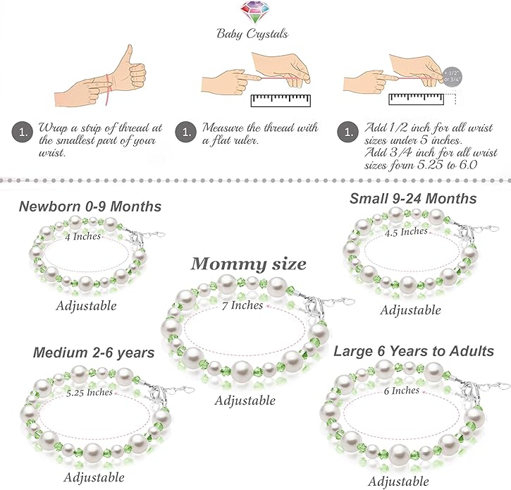 - ADJUSABLE BRACELET SIZING: newborn 0โ9 months 4 in, Infant 9โ24 months 4.5 in, toddler 2โ4 years 5.25 in, Girls to Adult 6 in, mommy 7 in. Includes a silver extender chain