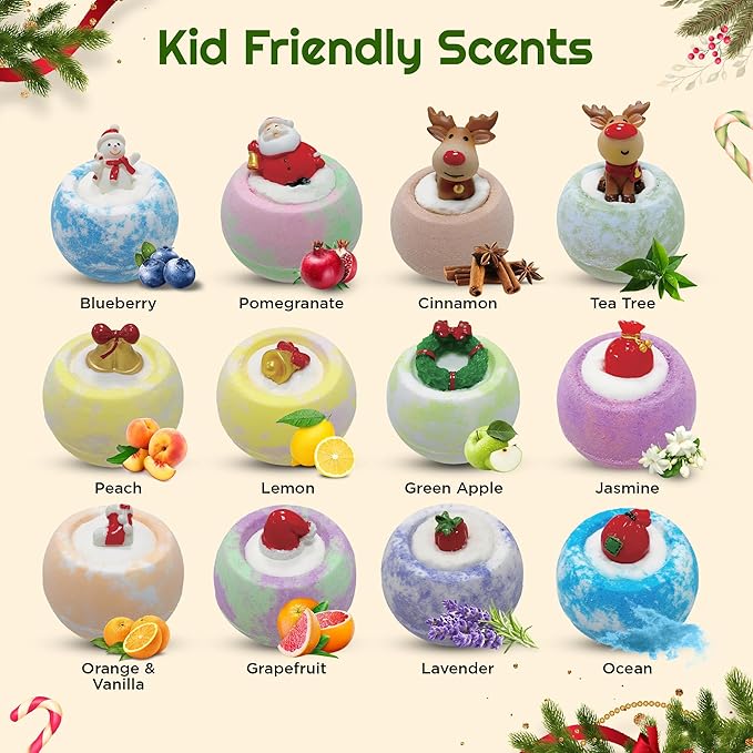 - Aromatherapy bath bombs with cute Christmas toy inside - Each of our bath bombs come adorned with adorable, small Christmas themed toys. Our bath bombs include kid friendly festive aromatherapy scents including Cinnamon, Lavender, Blueberry, Lemon, Orange & Vanilla, Tea Tree, Pomegranate, Grapefruit, Ocean, Jasmine, Peach, and Green Apple. Ideal christmas bath bombs for kids, kids bath bombs for boys and girls.