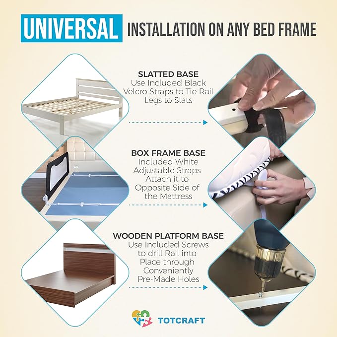 - ✅【Compatibility & Universal Fit for most bed types & sizes】: TotCraft Bed safety Rail Guard works with slatted beds, box springs or wooden base beds. Also suitable for Cribs, Queen beds, Double twins, king size beds, Single mattresses, Toddler beds, Tempurpedic beds, Bunk beds, full size beds, Twin beds, Double mattress, and Twin mattress.