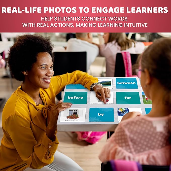 - REAL-LIFE IMAGES FOR RELATABLE LEARNING: High-quality photos make learning prepositions relatable and engaging; great for preschoolers, ESL learners, and speech therapy sessions; helps build practical communication skills