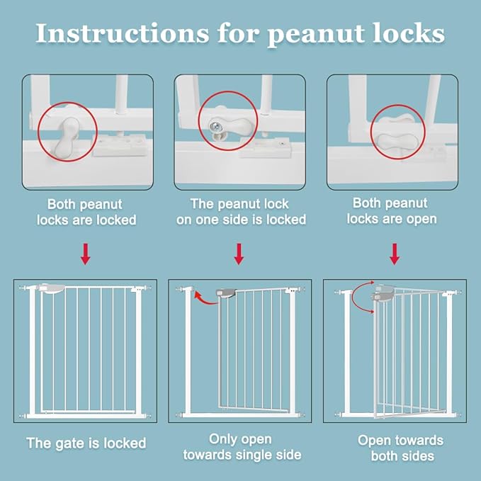 - 【Multiple modes】 Our triple lock gate has various statuses to meet your multiple needs in life. When all three locks are locked, little babies or pets will be stopped by it. At the bottom , there are two peanut locks to control the opening direction and locking. If the peanut lock on one side is locked, the gate can only be opened towards single side. If both peanut locks are open, the gate can swing both ways. Besides, it will stay open at 90 degrees and auto-close when it's less than that.