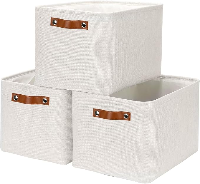 HNZIGE Large Fabric Storage Basket Organizers (3 PCS), Foldable Decorative Shelf Baskets with Leather Handles (Cream, 15" x 11" x 9.5")