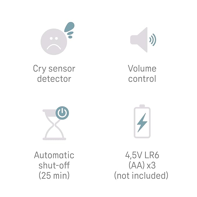 - Soft lullaby or white noise heartbeats: select from a lullaby or the comforting embrace of white noise heartbeats.