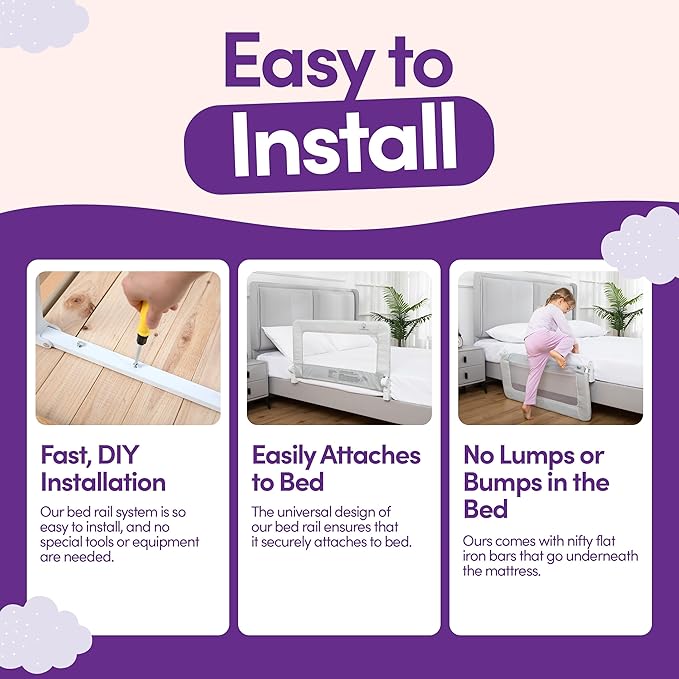 - EASY TO INSTALL - Our toddler bed rail includes a unique triple-way attachment system with velcro to attach to a slat bed base, adjustable straps to secure to box springs, and screws to attach to wooden bases. Choose ComfyBumpy for a safe sleep environment for your child, today!