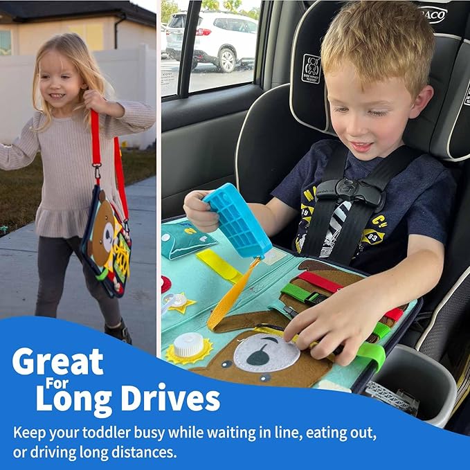 - Travel Busy Board for Toddlers: Perfect for on-the-go learning, this travel-friendly busy board for toddlers promotes sensory exploration and keeps little ones engaged during airplane, car, and long trips.