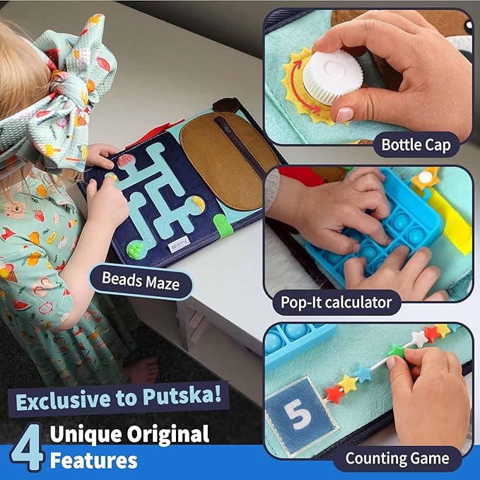 - Busy Board for Toddlers 3+ Years Old: Putska's busy board boosts fine motor skills with engaging activities like zippers, Velcro, and pop-it calculator, promoting sensory learning, coordination, and focus.