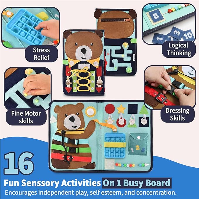 - Montessori inspired Busy Book for Toddlers 3-5: Designed to teach fine motor skills, this busy book features pop-it calculator, bottle cap opening, and a maze, making it an excellent Montessori sensory toys for toddlers.