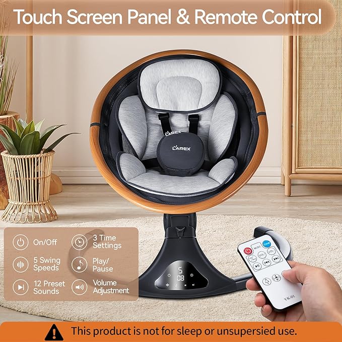 - Touch Panel & Remote Control: Easy operation with 2-way control, allowing parents to select the desired swing timer setting of 8, 15, or 30 minutes.