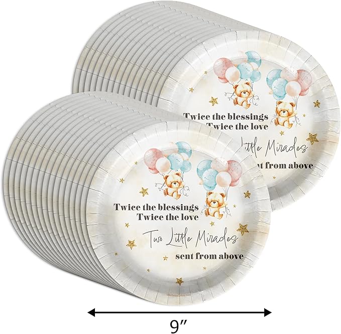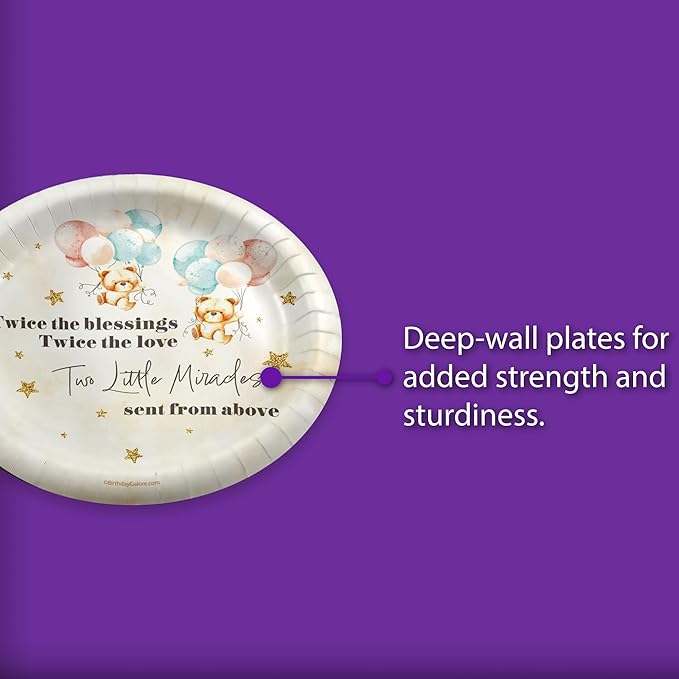 Birthday Galore Twin Teddy Bear Baby Shower - 32 Piece Disposable Party Supplies - Twins Baby Shower Decorations - Round Party Plates - Large 9 Inch Paper Plates In Bulk