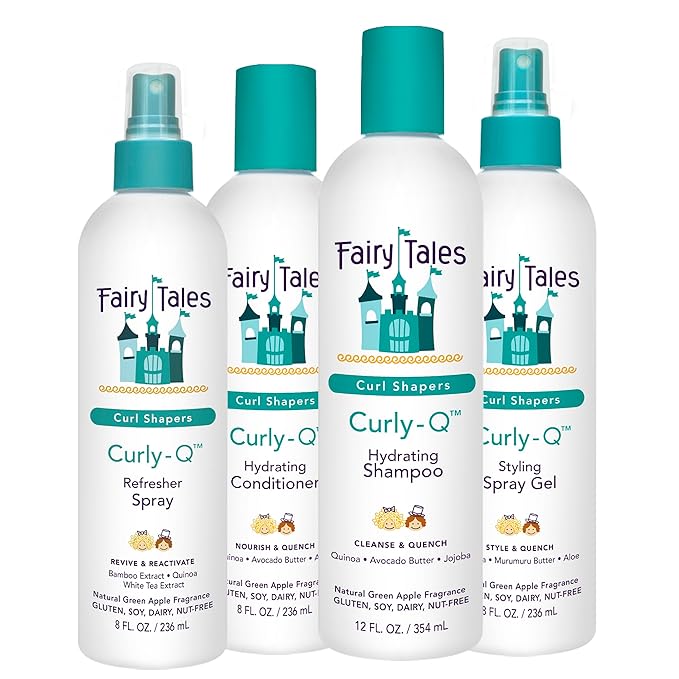 Fairy Tales Curly Hair Care Kit for Kids - Q Quad: Curly Hair Shampoo, Conditioner, Spray Gel, and Spray Refresher Bundle, Green Apple Scent, Phthalate, Paraben, Gluten Free, Hydrating, 4 Count