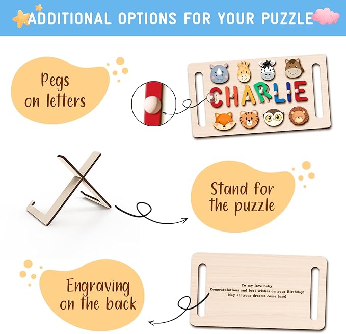 - 【Personalized Baby Gifts for Many Occasions】 When it comes to baby's birthday, Christmas, New Year or other festivals and anniversaries, every parent would like to choose a suitable gift for their lovely baby. Coincidentally, the new and improved custom name puzzle for kids personalized are here. Suitable for baby gifts, plus exquisite packaging makes you give gifts without stress.