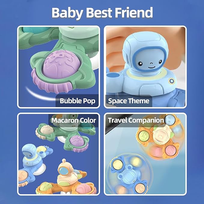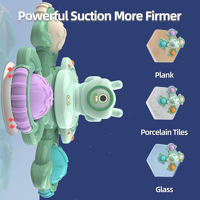 - Suction Cup Spinner Toys - The baby spinner toys with suction are cute design of Space travel,let your kid have a space dream and help your baby explore space. Astronauts, robots and aliens style are easy to attract baby's attention.