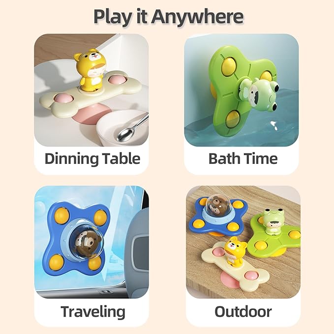 - Suction Cup Spinner Toys - The baby spinner toys with suction are cute design of animal, help your little one cognitive shape and color. Dog, bear and frog style are easy to attract baby's attention.