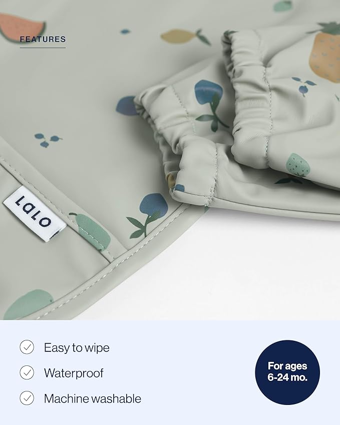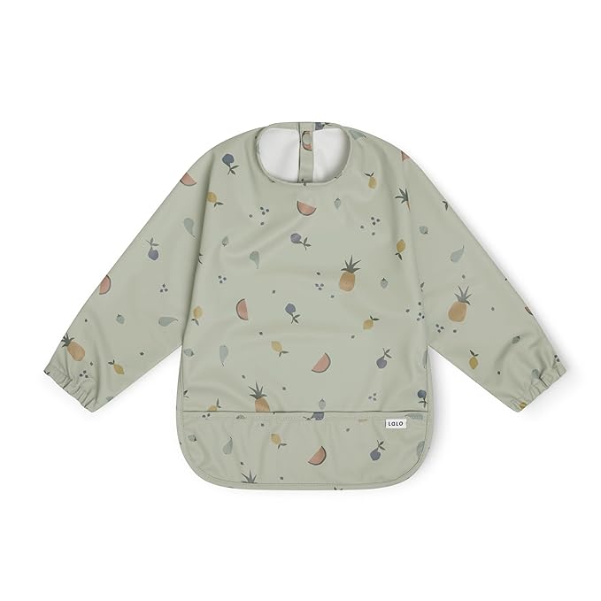 Lalo Smock Bib - Long Sleeve Bib for Infants and Toddlers - Elastic Cuffs, Large Catch-All Pocket, Waterproof Recycled Polyester - Easy to Clean for Mealtime and Art Time - Fruit Print Sage Infant
