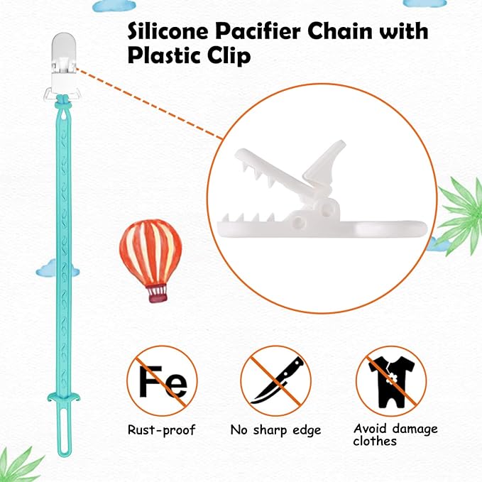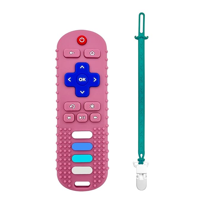 - [A thoughtful and well-designed toy strap]: Our silicone pacifier clip is a perfect companion for your baby's pacifiers and teething relief items, keeps your little one's toys and pacifiers clean and close to baby, preventing them falling on the floor or getting lost. Made of food grade silicone, is free of BPA, lead, phthalate and no odor, without worrying about your baby playing or chewing on the pacifier strap. Comes with a TV remote shaped chew toy and a cute pacifier clip.