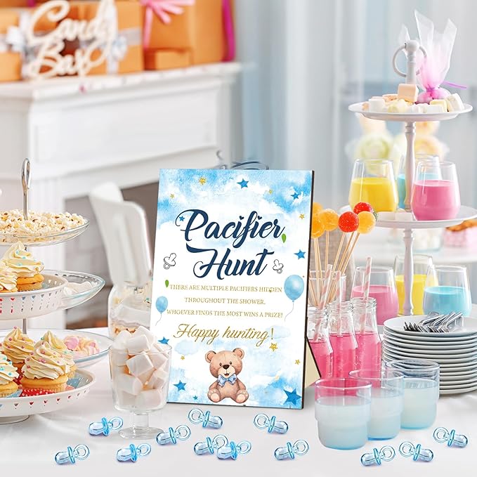 Thyle 51 Pcs Pacifier Hunt Baby Shower Games Include Hunt Sign and 50 Acrylic Pacifiers for Baby Shower Game Decoration Gift Sets Gender Reveal Party Decor(Blue Bear)