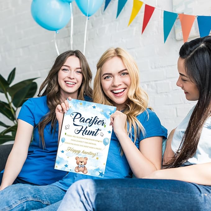- Nice and Elaborate Combination: there are 50 baby shower pacifiers, 1 blue bear baby shower game hunt sign in the package, enough for you to plan your baby shower party and to share with your friends and family