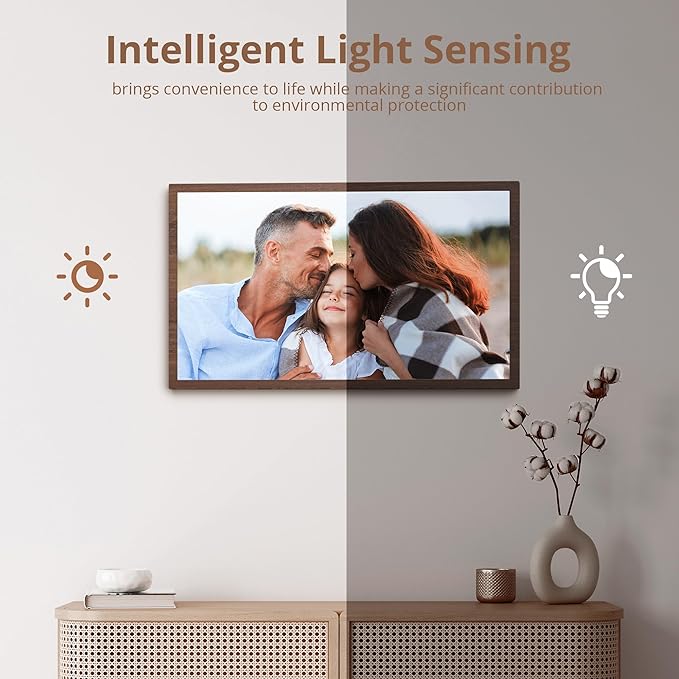 - AUTO-ROTATE & BRIGHTNESS ADJUSTMENT - The digital picture frame has the ability to automatically switch between portrait and landscape orientations. It can be placed on a table or hung on a wall. Additionally, the screen brightness can be automatically adjusted based on changes in ambient light.(Remote control,Not TouchScreen)