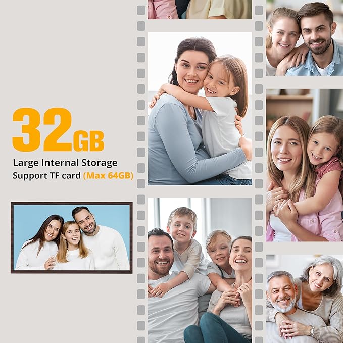 - 32GB LARGE MEMORY: This digital picture frame built-in 32GB memory, it also supports TF card (Max 64G) and USB drive connection, enabling you to read files and export received photos and videos for better management of albums.