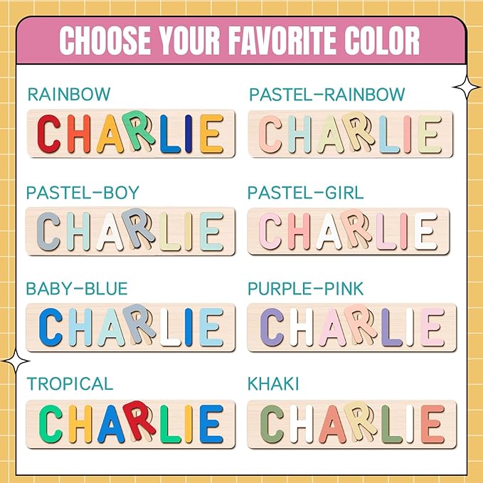 - Baby Name Puzzle: A personalized wooden name puzzle designed just for your child. Available in one, two and three rows, our puzzles offer 108 elements and 8 color schemes. You can customize it with the name, style and pattern you want.