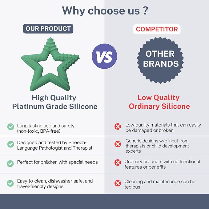 - Platinum Grade Silicone: The TalkTools Sensory Teeny Teether Star is made from 100% LFGB Platinum Grade Silicone, providing a safe and effective alternative to thumb sucking, teeth grinding issues, and pacifiers