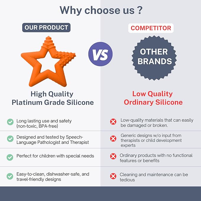 - Platinum Grade Silicone: The TalkTools Sensory Teeny Teether Star is made from 100% LFGB Platinum Grade Silicone, providing a safe and effective alternative to thumb sucking, teeth grinding issues, and pacifiers