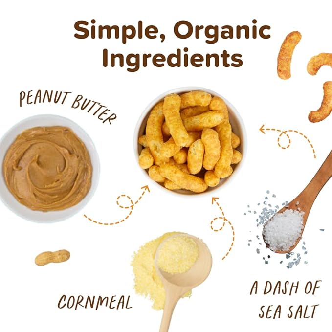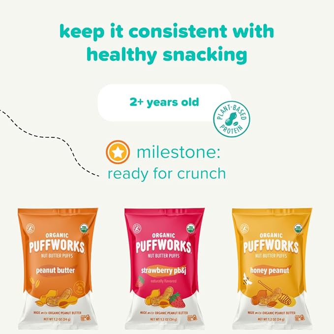 - 12- 0.5 Ounce Bags of Puffworks baby Organic Nut Butter Puffs (6 peanut butter, 6 almond butter)