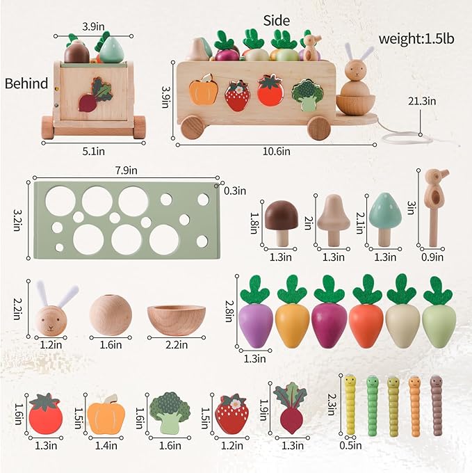 - Montessori Early Education Toys: High quality wooden toy includes 6 carrots, 5 fruits and vegetables, 5 worms, 3 mushrooms, a woodpecker and a rabbit. Using rich colors, each part has a different color, toddlers can identify different shapes and colors to sort and match.