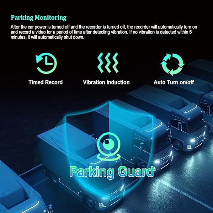 - 【Parking Monitoring】: When someone knocks down or moves your car after car power is turned off, the recorder will automatically turn on and record a video for a period of time after detecting vibration. If no vibration is detected within 5 minutes, it will automatically shut down