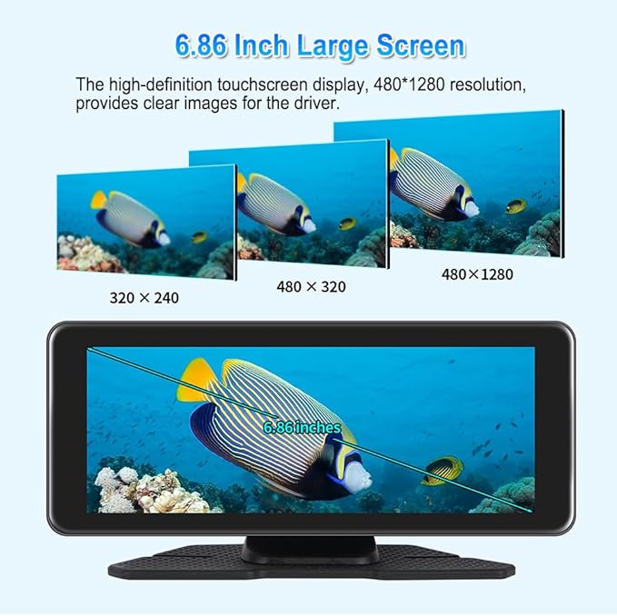 - 【6.86 Inch Touchscreen and Two Host Brackets】:The car DVR has a 6.86 inch HD touchscreen, with 480 * 1280 resolution. Provide clear visual effects when viewing map navigation and video playback. The car play display screen with the rotatable suction cup mount and adjustable height self-adhesive vertical bracket secures your dashboard console or windshield and can be easily removed and stored.