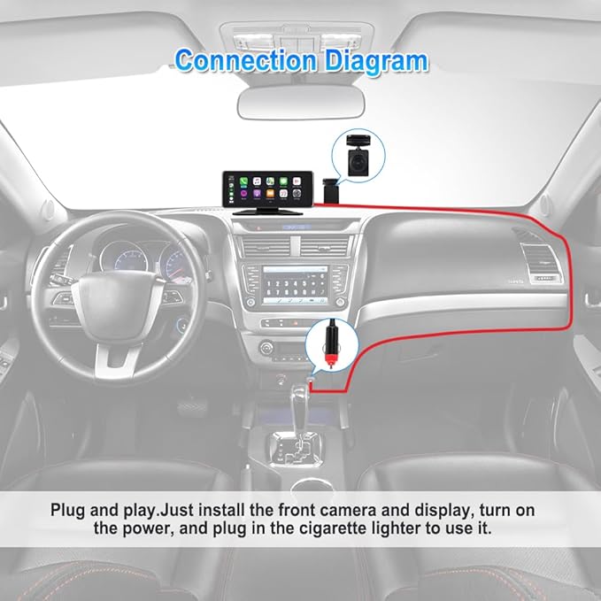 - 【Simple and Beautiful Installation】:Plug and play directly with dashboard via connect cigarette lighter. Specially designed unique power cord interface, tightly and firmly connected, not easily detached. The power cord can be connected from the back of the monitor, rather than from the side interface, and the wiring is simple and beautiful. You don't need to disassemble the car, just install it on the dashboard and keep your car original.