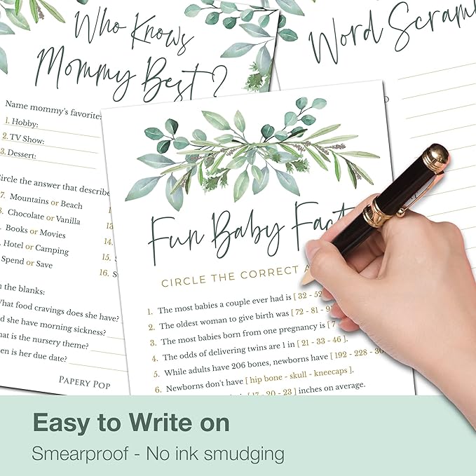 Papery Pop Baby Shower Games - Set of 4 Games for 25 Guests - Double Sided Cards - Eucalyptus
