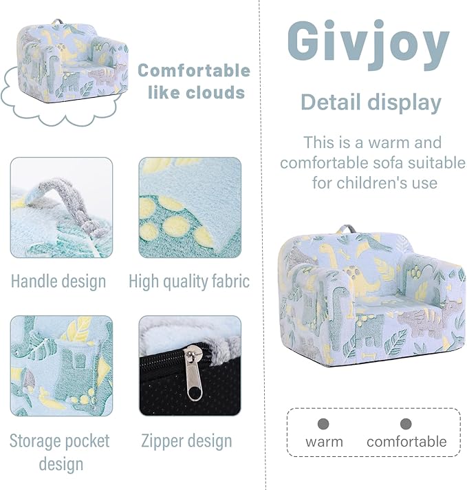 - 【Toddler Sofa Glow in The Dark】 Unique luminous design, cute dinosaur pattern. Simply place the toddler sofa under a bright light or sunlight for 10-15 minutes and bring it to a dark room to see the magic glow. The brighter the light shines, the stronger it glows in the dark.