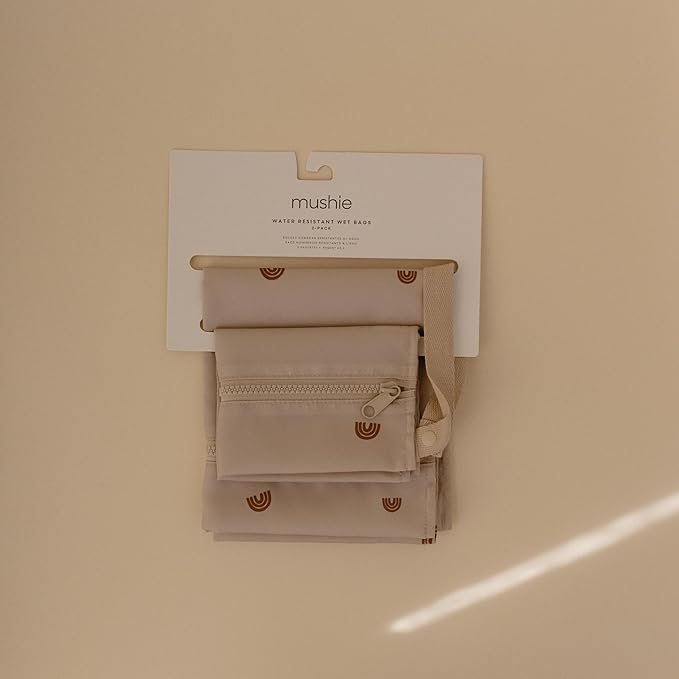 - Comfort on the Go: Featuring a zipper closure and machine washable, water resistant material, mushie wet bags are designed to help tackle messy situations on the go. The handles include a snap closure to easily hang or attach to a stroller.