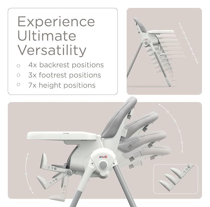 KÜB 3-in-1 Foldable Baby High Chair, 7 Height & 4 Recline Adjustable Seat & Tray for Easy Clean, 2 Locking Wheels, Multifunctional Infant High Chairs for Babies and Toddlers (Grey, with Toys)