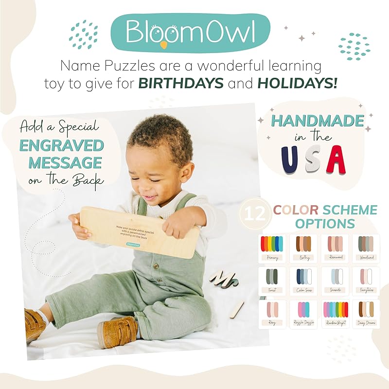 Personalized Wooden Name Puzzle for Kids, Handmade in USA by Bloom Owl, Upper and Lowercase, Custom Baby Gifts for Boys and Girls, Easter or First Birthday, Montessori Toys for Toddlers 1-3