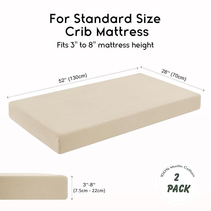 - Perfect Fit: Featuring a 360Β° all-inclusive design with a high-elastic elastic band, which ensures our muslin crib sheets stay flat and non-slip without displacement. Measures 52''X 28'', our standard crib sheets can snugly fit most standard crib and toddler mattresses up to 9'' thick, creating a comfy and safe sleep for your little one.