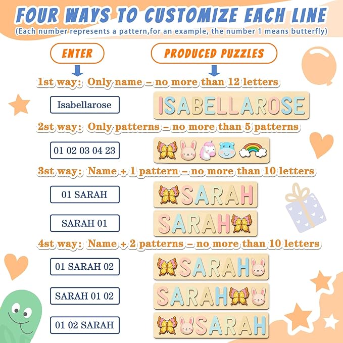 - Personalized Name Puzzle: Customize your baby's name in a wooden board with 49 kinds of patterns and 8 different color schemes. Making each puzzle truly one-of-a-kind. This will be a unique gift for new born babies